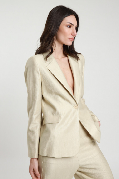 Schmale Ein-Knopf-Jacke aus glänzender Viskose, Pattentaschen und klassischem Revers. 58%vi 31%ny 11%pa+100%pl