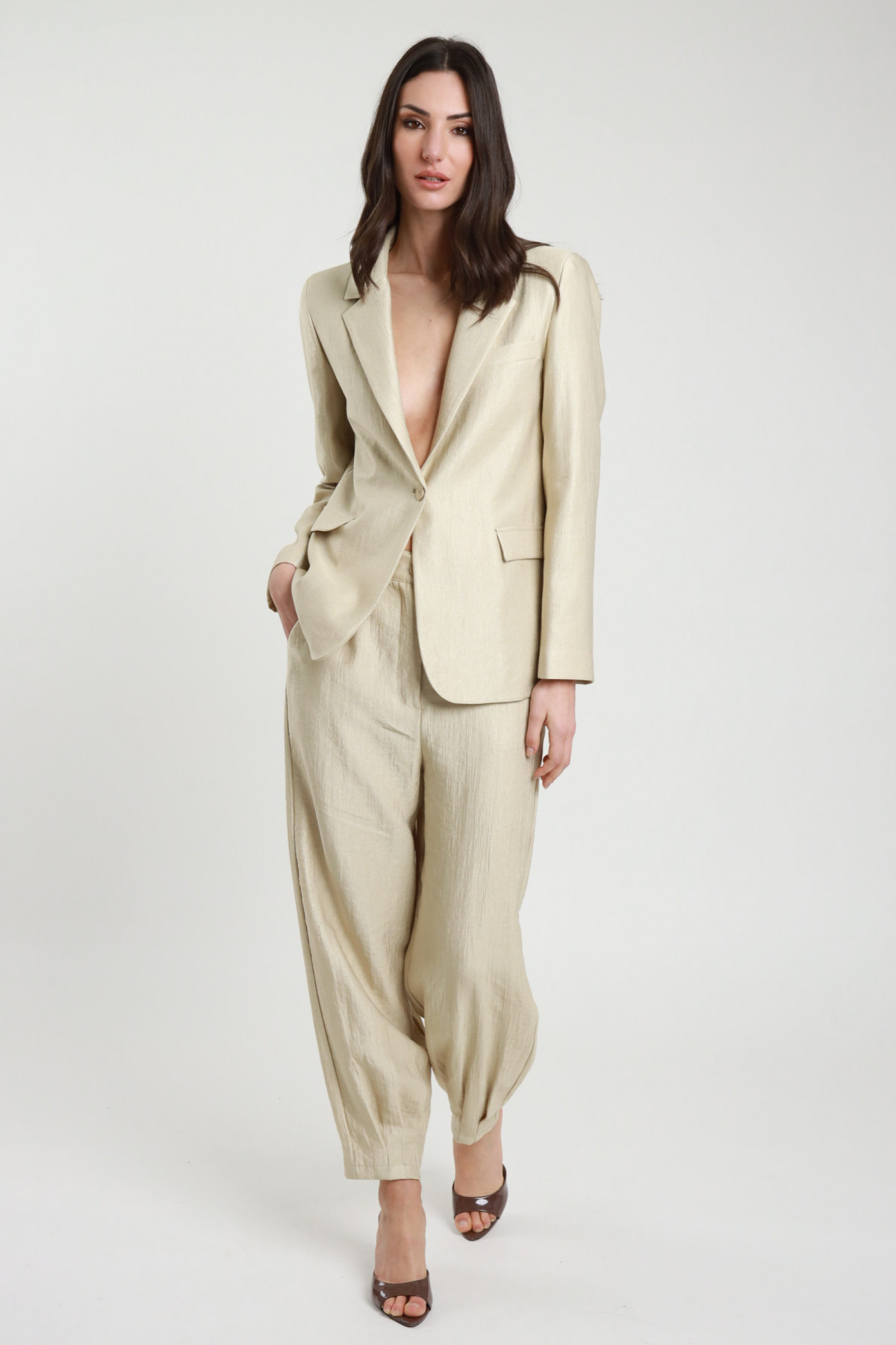 Hose mit hoher Taille, weicher Linie, weitem, an den Knöcheln schmal zulaufendem Bein, Seitentaschen, glänzendem Stoff. 58%vi 31%ny 11%pl
