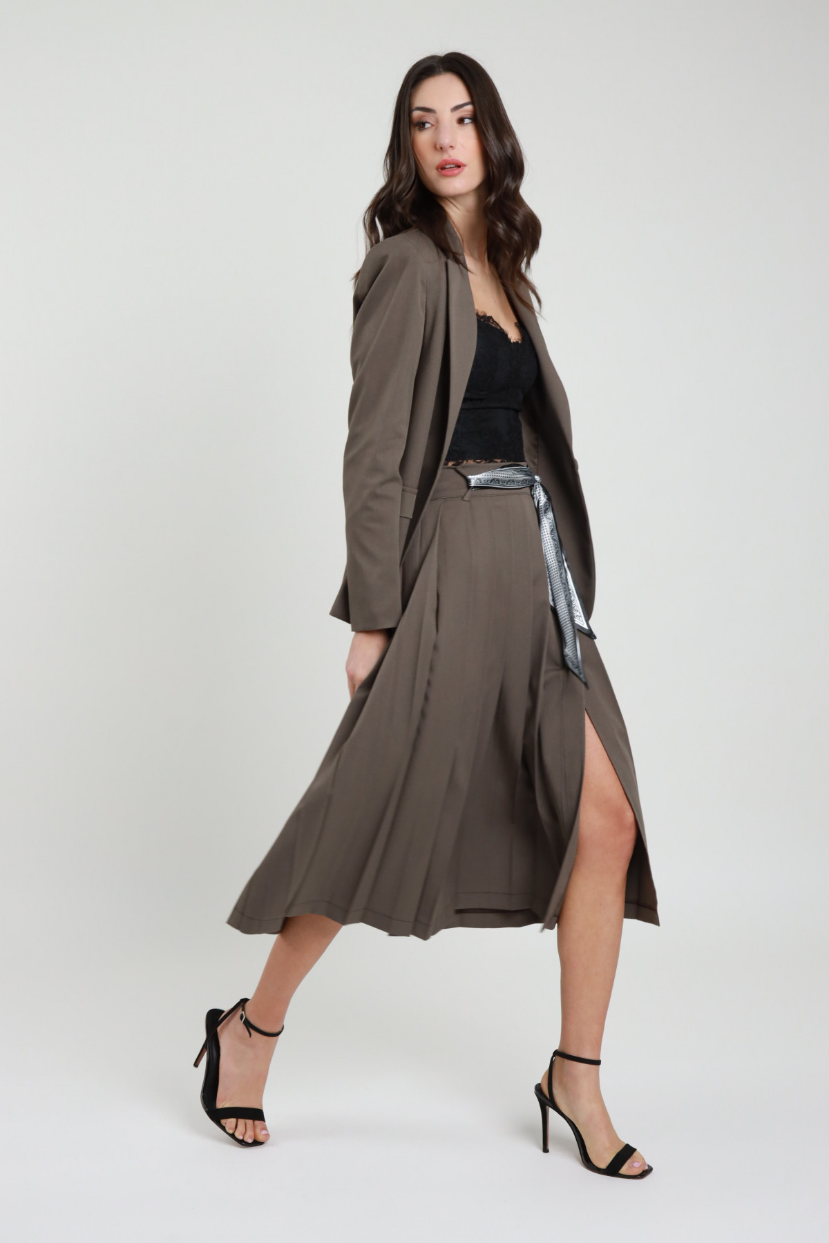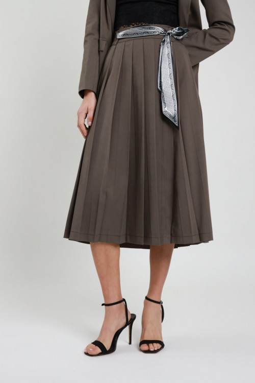 Weiter, hoch taillierter Midirock mit Seitenschlitz, Reißverschluss hinten und Gürtelschlaufen in der Taille. Schal befestigt. 78 %pl 18 %vi 4 %ea
