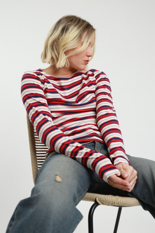 T-shirt Maniche Lunghe Scollo Barchetta a Righe.