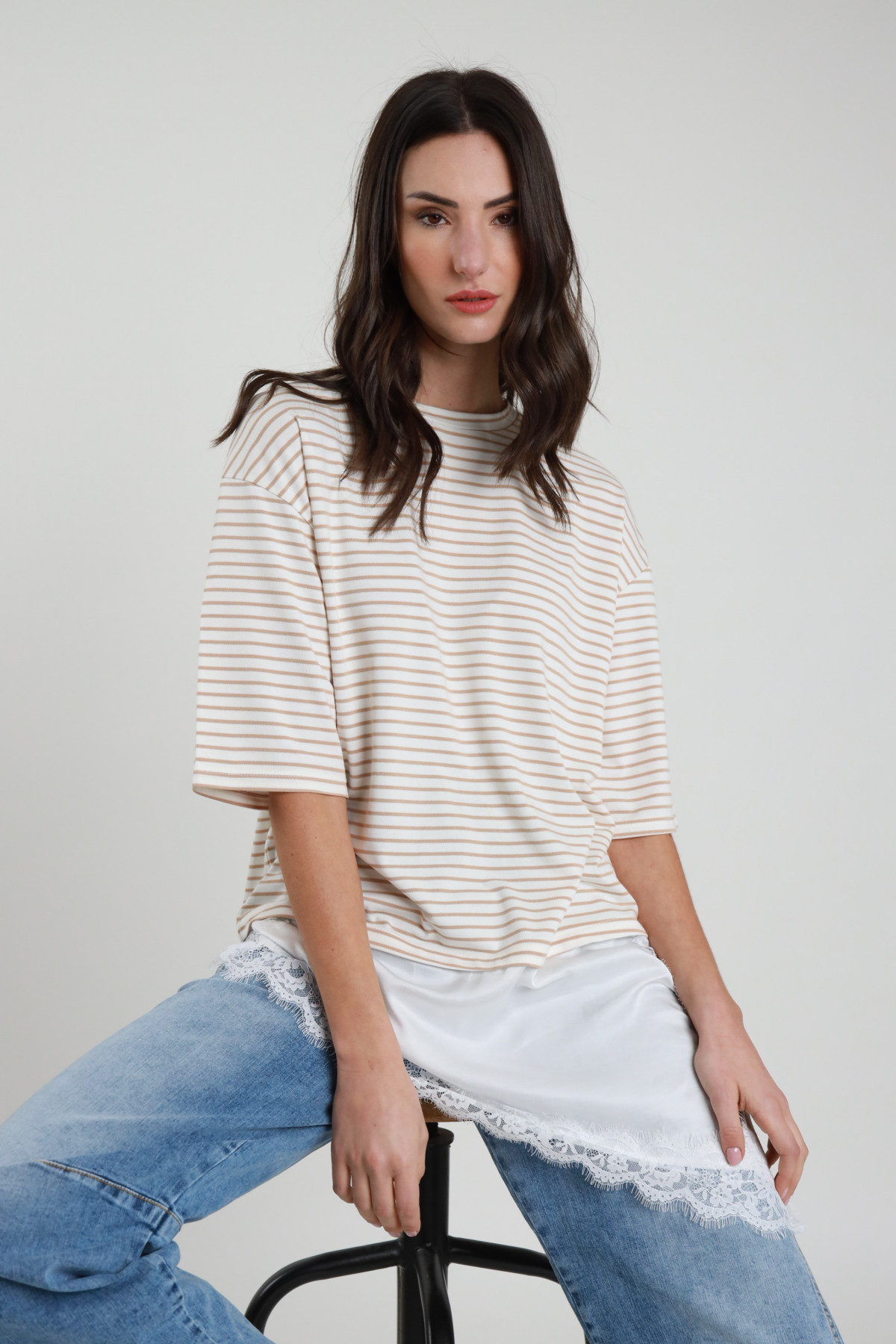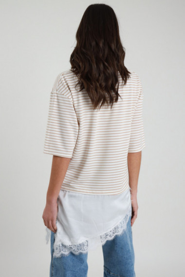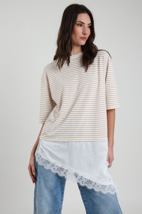 T-Shirt Oversize, Con manica Extra, Spalla Scesa, Girocollo Stretto, Rigata e Con Tessuto Sottoveste Con Pizzo Attaccato Sul Fondo. 50%vi 25%pl 20%co 5%ea