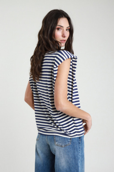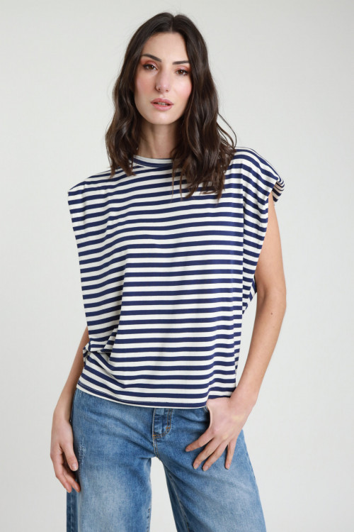 Übergroßes ärmelloses T-Shirt aus Stretch-Viskose mit gepolsterten Schultern und Streifenmuster. 94 %vi 6 %ea