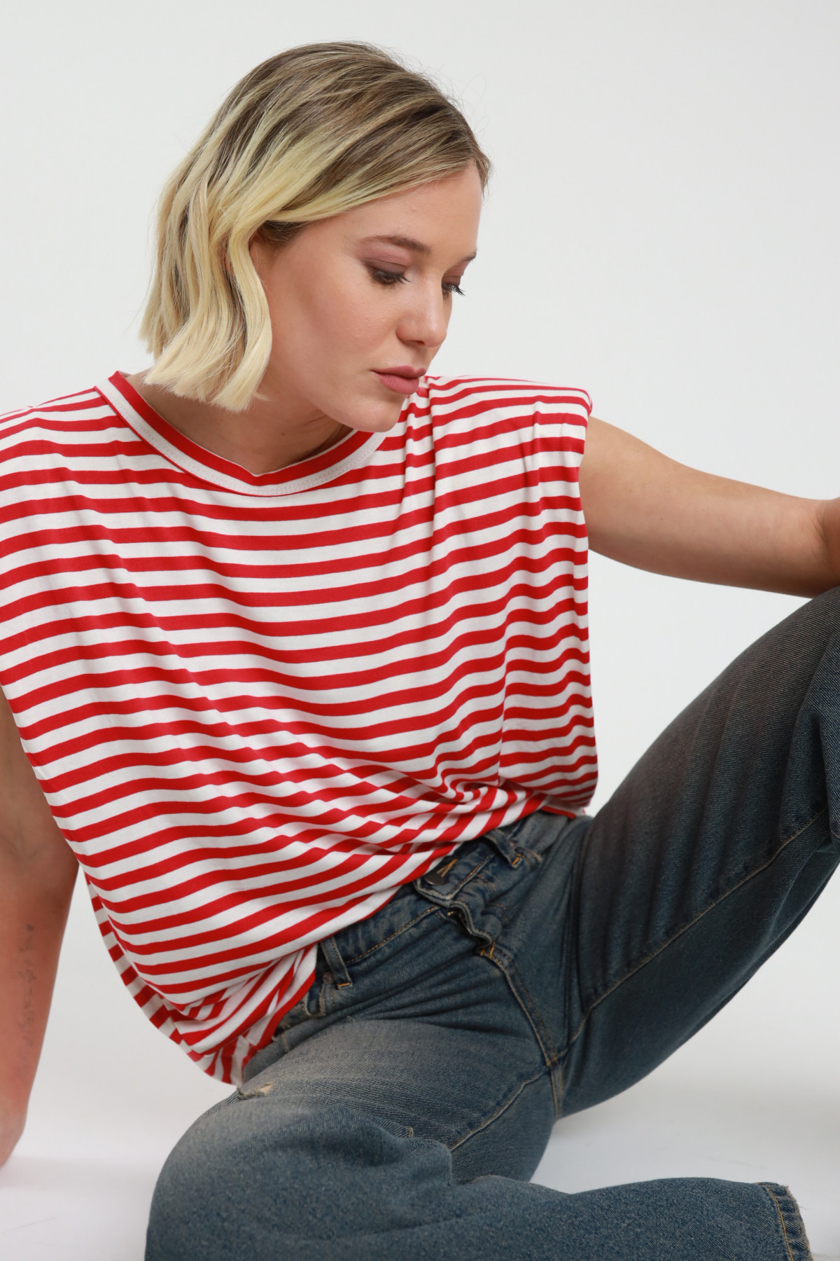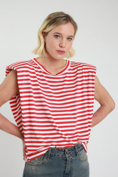 Übergroßes ärmelloses T-Shirt aus Stretch-Viskose mit gepolsterten Schultern und Streifenmuster. 94 %vi 6 %ea
