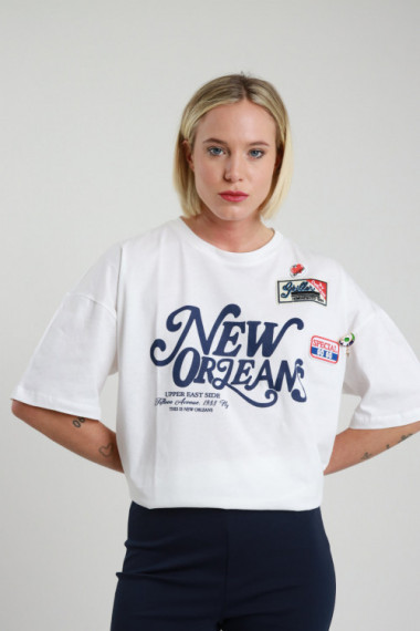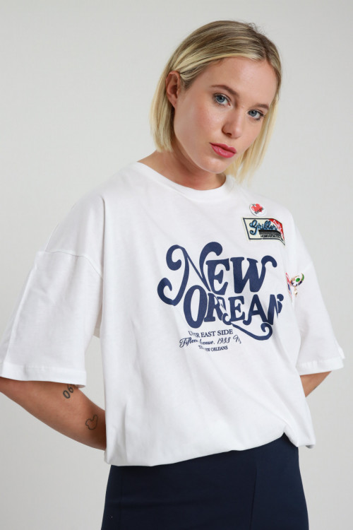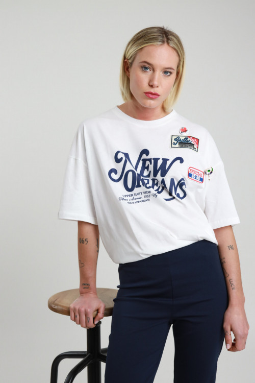 T-Shirt Over, Girocollo Moribo, Manica Extra Stampa Con Angelino e Scritta "Los Angeles With Love". 94%co 6%ea
