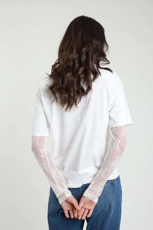 T-Shirt Girocollo Maniche Corte con Stampa sul Fronte + Seconda T-shirt in Pizzo a Maniche Lunghe Rimovibile.