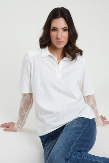 Poloshirt mit Spitzenärmeln und Schmuckknopf. 100 % CO + 94 % pa 6 % ea