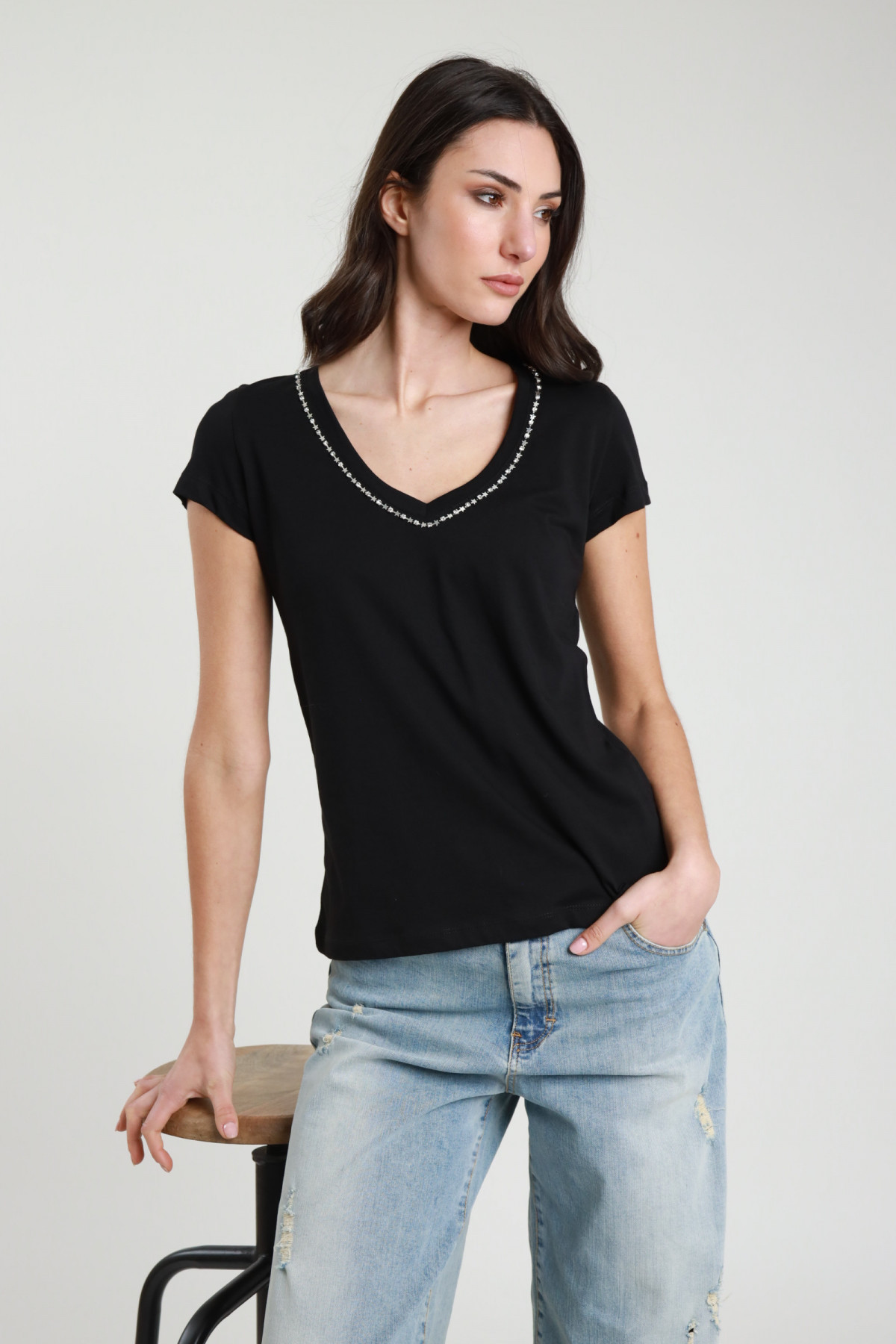 T-Shirt in Cotone Elasticizzato Effetto Slavato con Scollo a V e Borchie nel Giromanica.