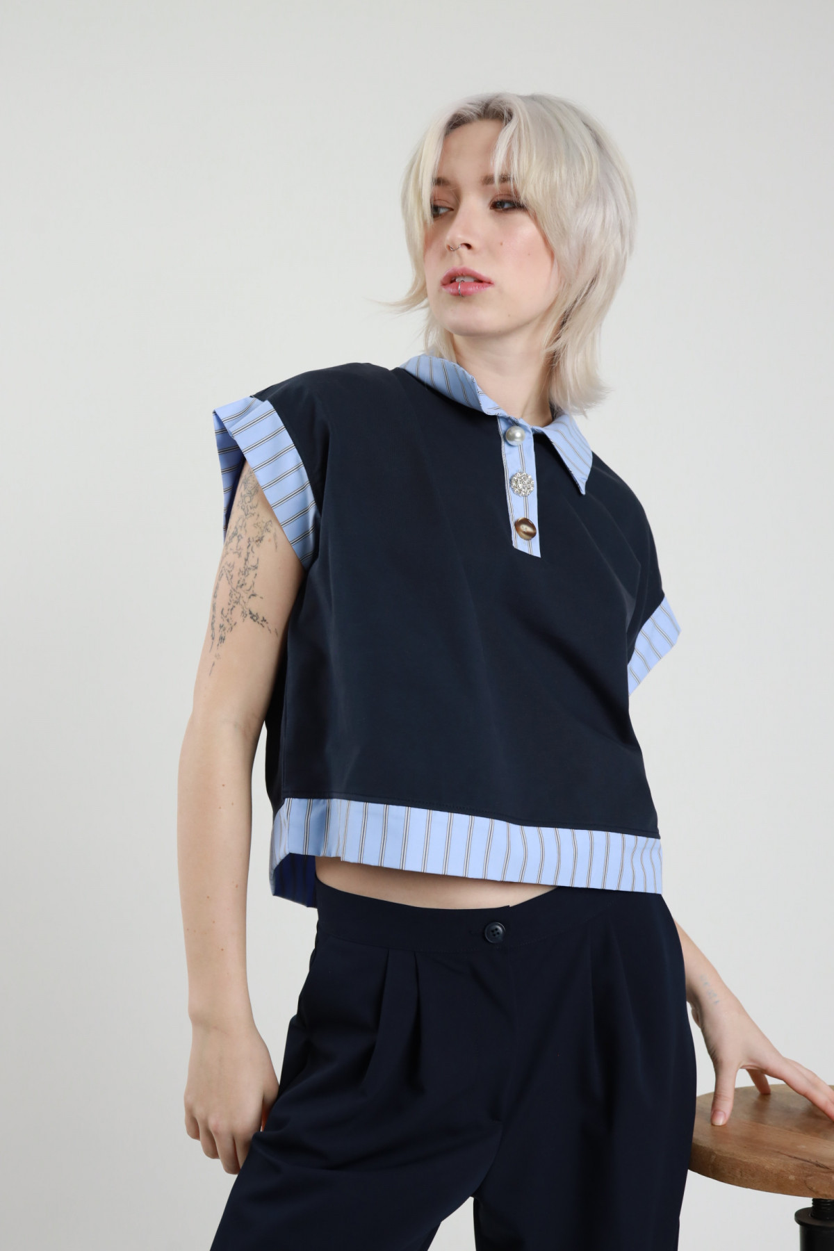 Half-sleeved T-Shirt in a striped pattern with darts on the shoulder and asymmetrical neckline. 80%vi 20%ny