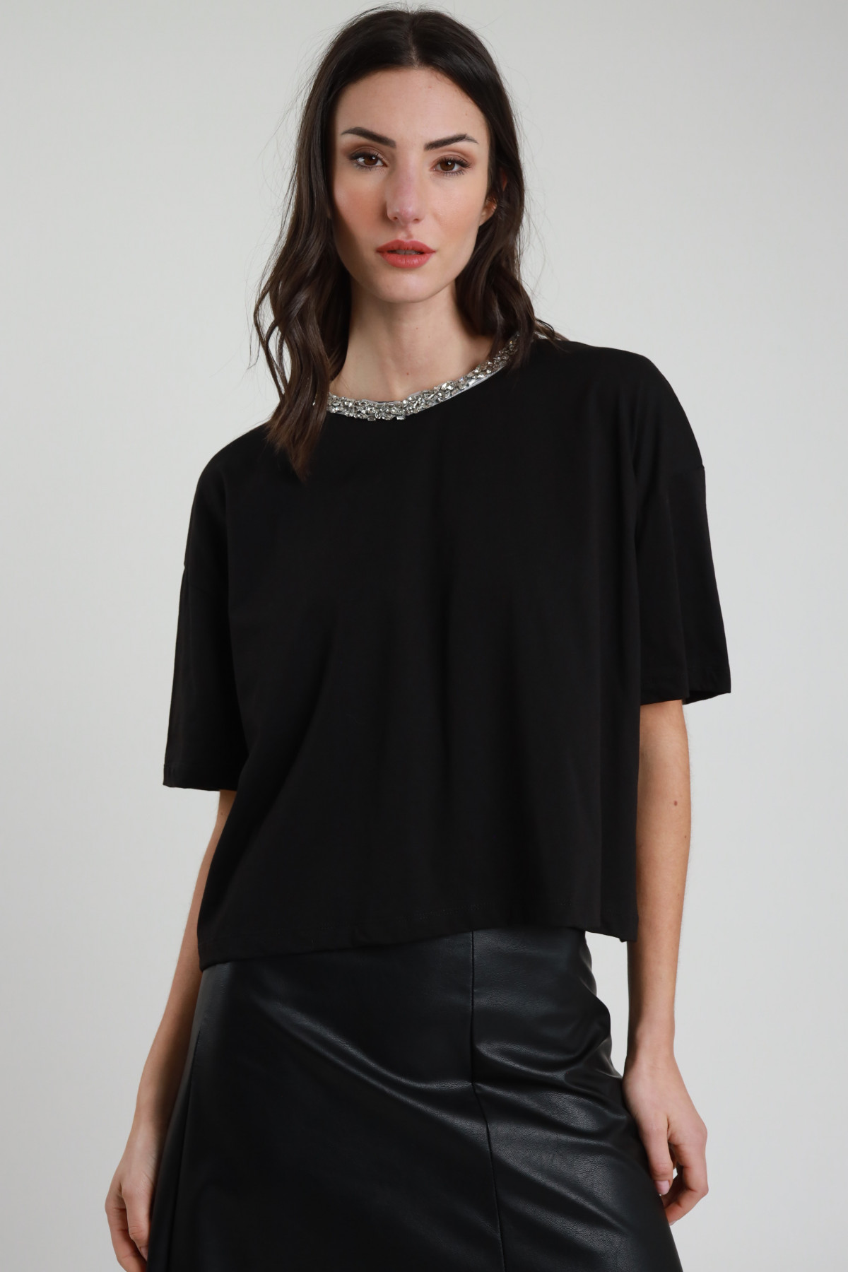 Kurzes T-Shirt aus Baumwolle mit halben Ärmeln, rundem Halsausschnitt und Knopf auf der Rückseite. 100 % co