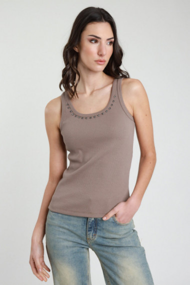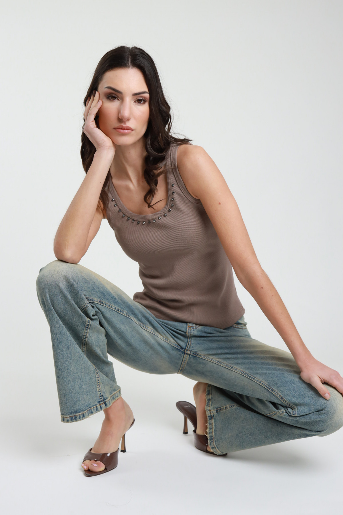 Canotta Canettata Con Scollo Tondo e Spalline Strette, Borchiette In Strass Apllicate. 95%co 5%ea