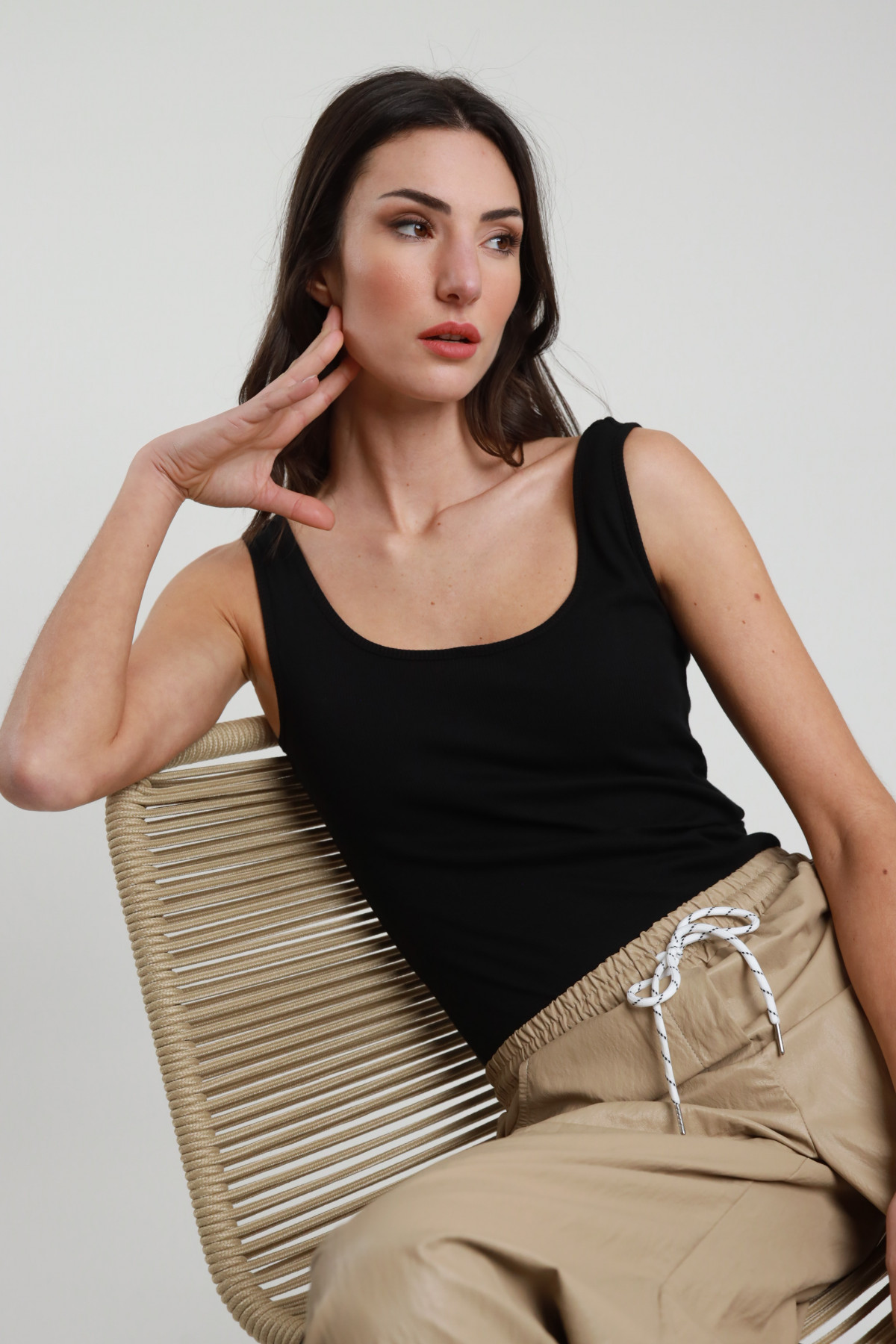 Canotta in Cotone Elasticizzato a Costine con Scollo a Bottoni Gioiello.