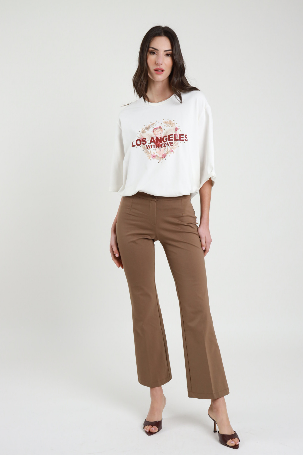 T-Shirt Over, Girocollo Moribo, Manica Extra Stampa Con Angelino e Scritta "Los Angeles With Love". 94%co 6%ea