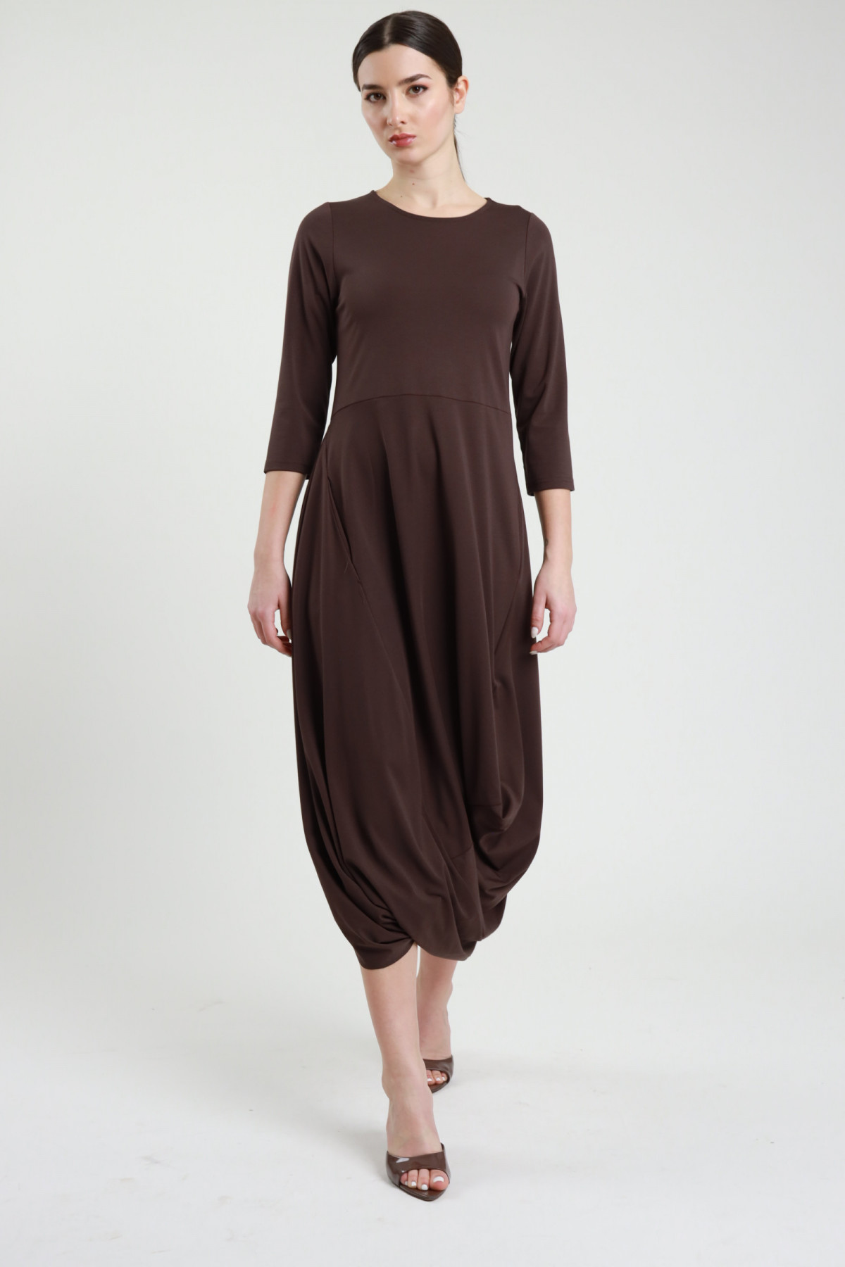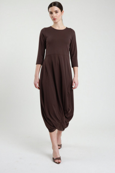 Abito A Manica Lunga Con Anello Centrale Bucato e Arricciature. Taglio Midi.