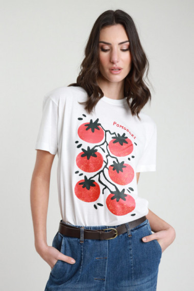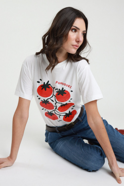 T-Shirt Girocollo Con Stampa Pomodori, Fit Morbido. 100%co
