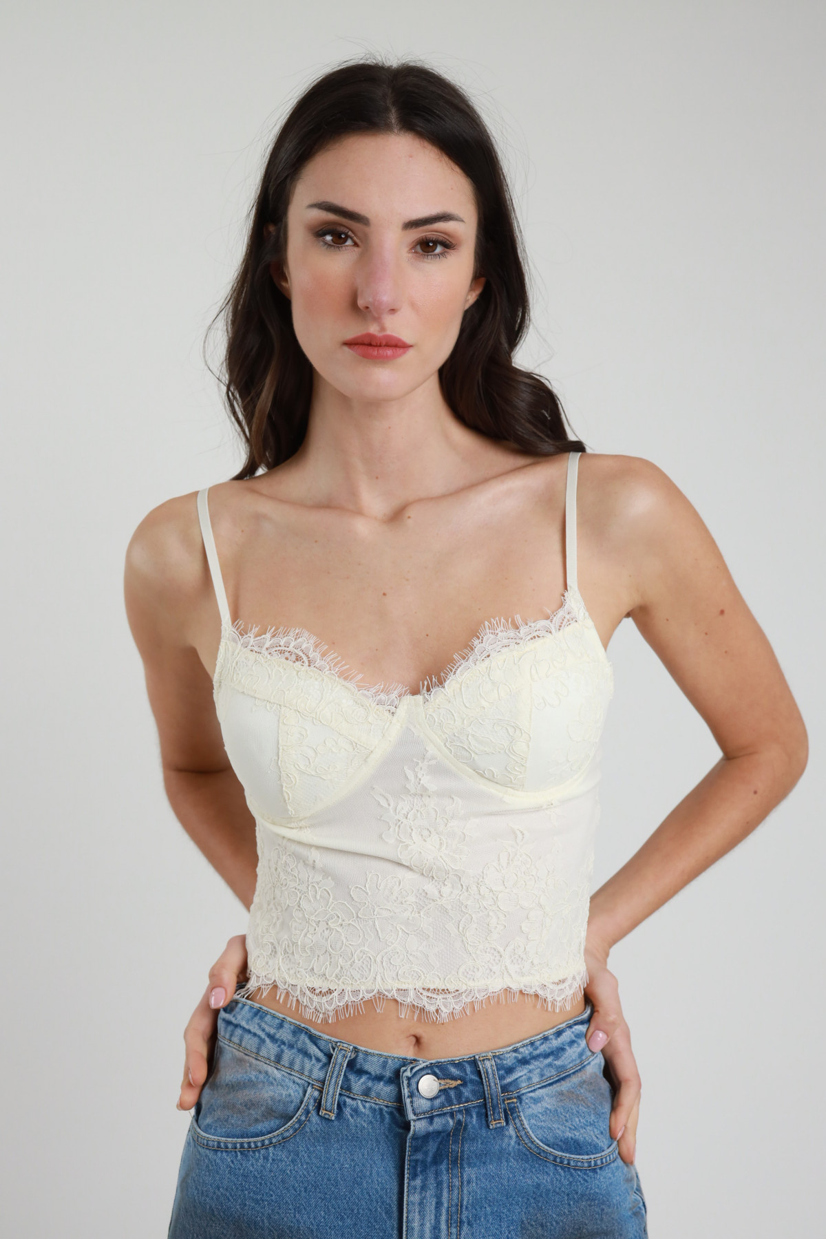 Crop-Top aus Spitze mit schmalen Trägern und gepolsterten Körbchen. 90%ny 10%ea