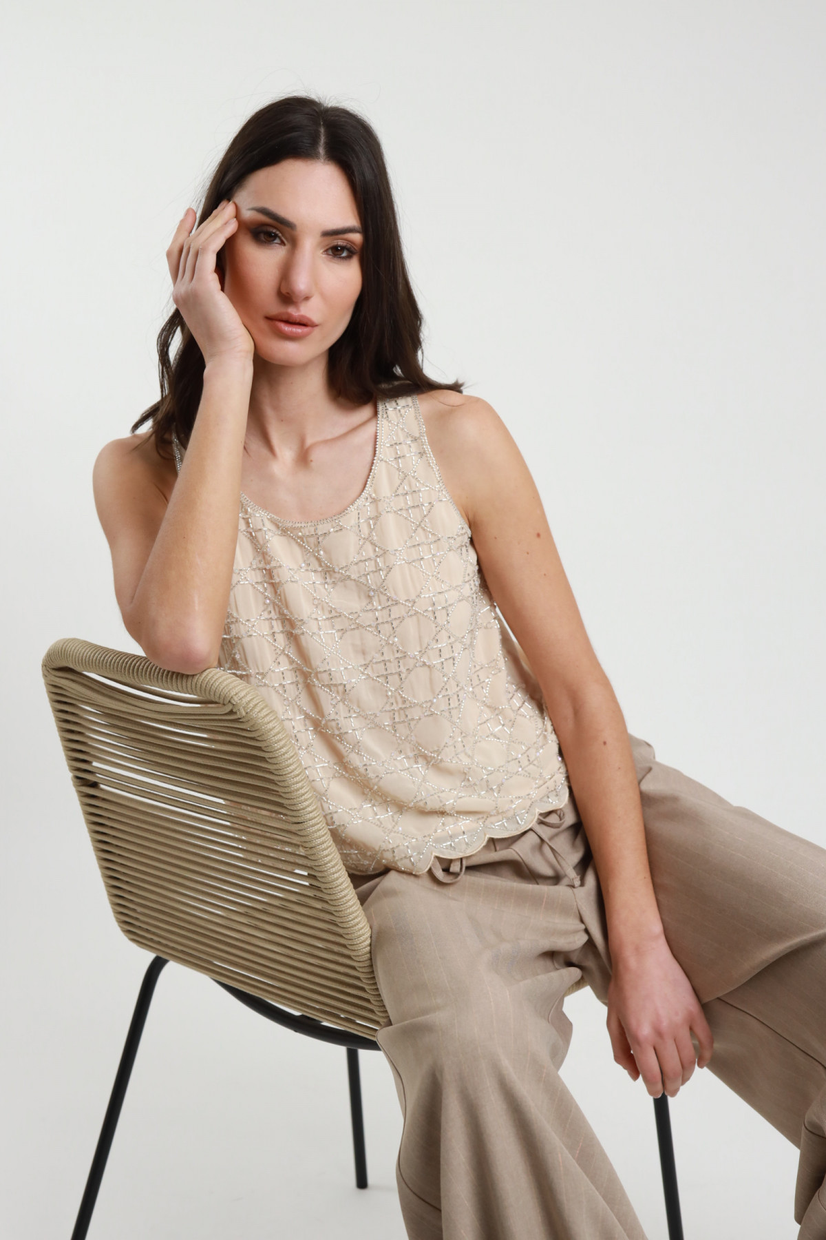 Canotta con Ricamo Perline sul Fronte, Chiusura Bottoncino sul Retro.
