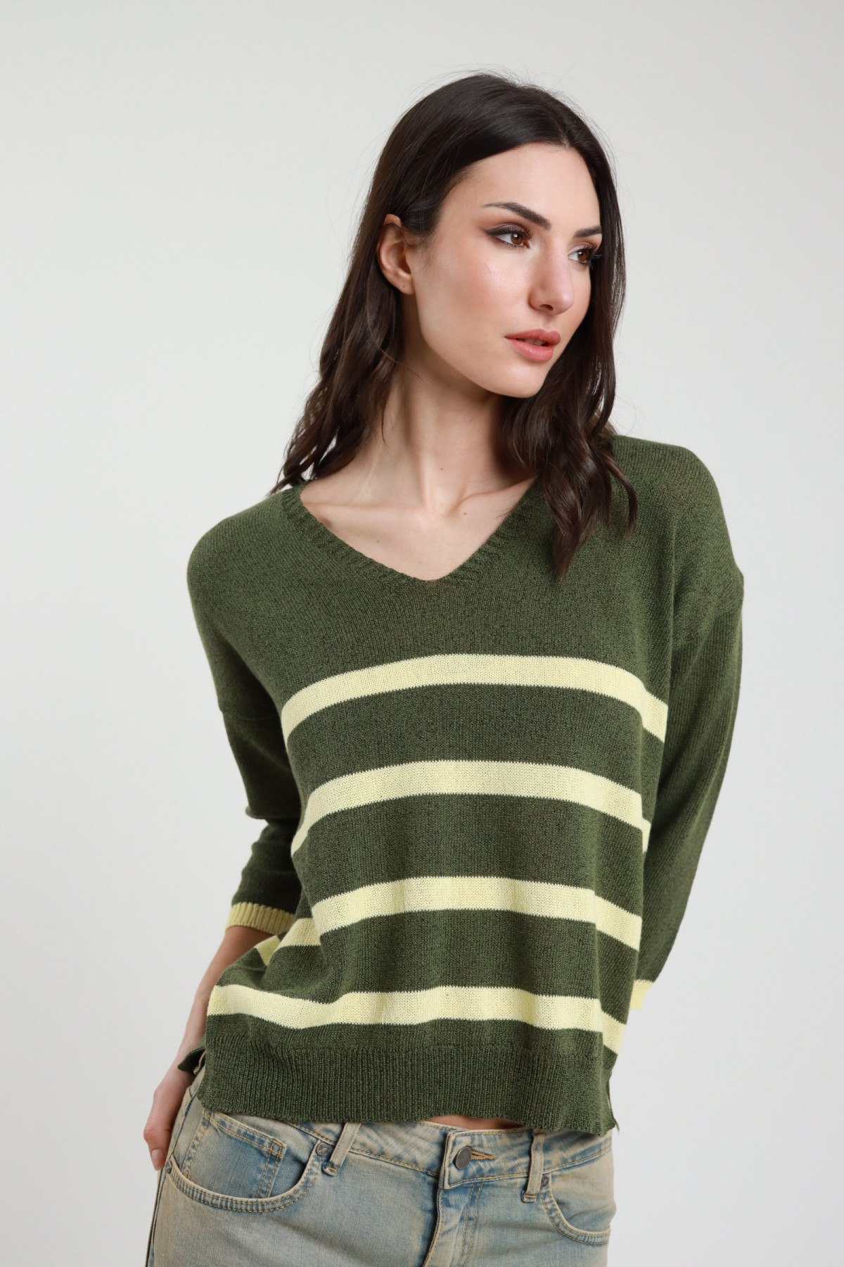Pullover mit überschnittener Schulter und V-Ausschnitt im Streifenmuster. 88 % Stk. 12 % pa