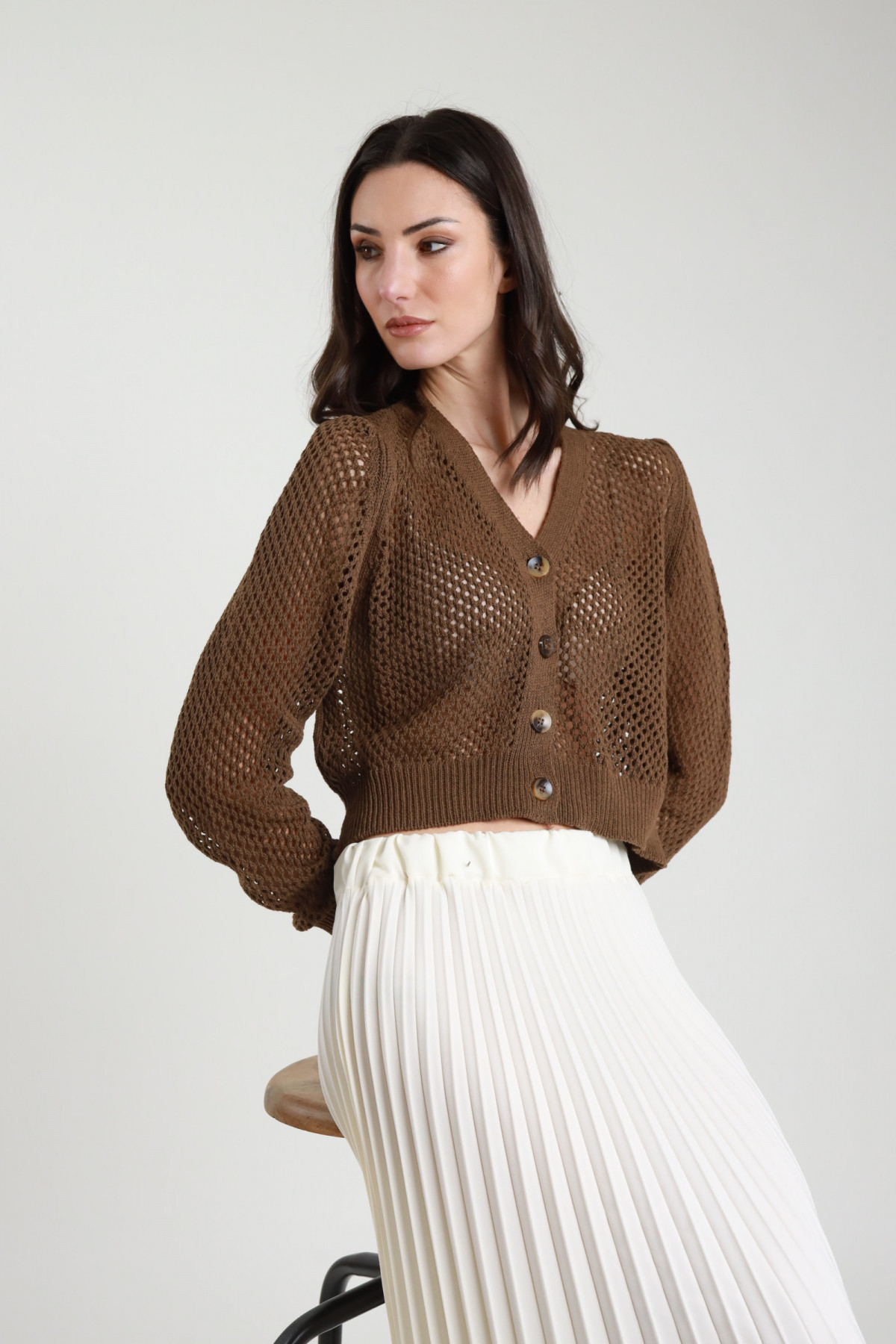 Perforierter Crop-Cardigan, Knopfverschluss. 50 % CO 50 % AC