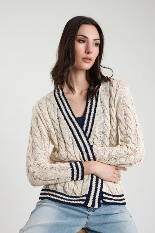 Offener Cardigan mit Zöpfen und kontrastierenden Streifen an den Rändern. 100 % Wechselstrom