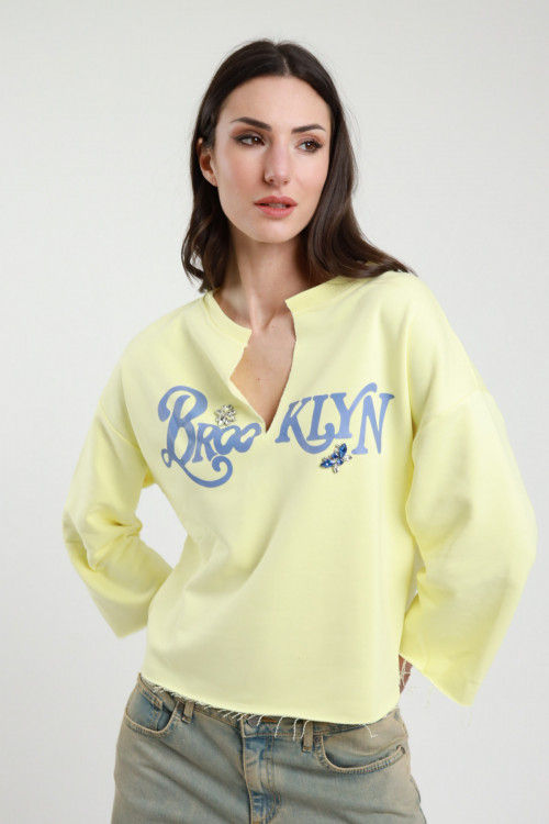 Sweatshirt mit V-Ausschnitt am Ausschnitt, Cabochon, „Brooklyn“-Schriftzug, Box-Fit und ungesäumtem Schnitt am Saum und an den Ärmeln. 65%co 35%pl
