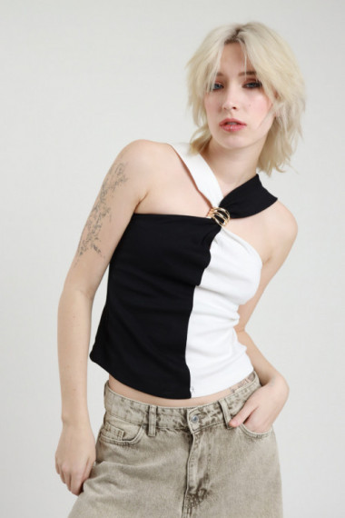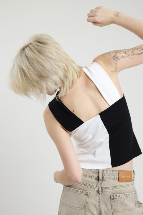 Top a Fascia Asimmetrico, in Ecodainetto, con Chiusura Zip sul Retro.