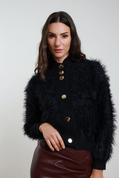 Cardigan Ecopelliccia con Chiusura a Bottoni e Orli in Maglia