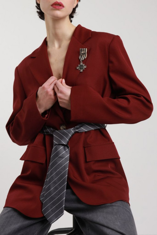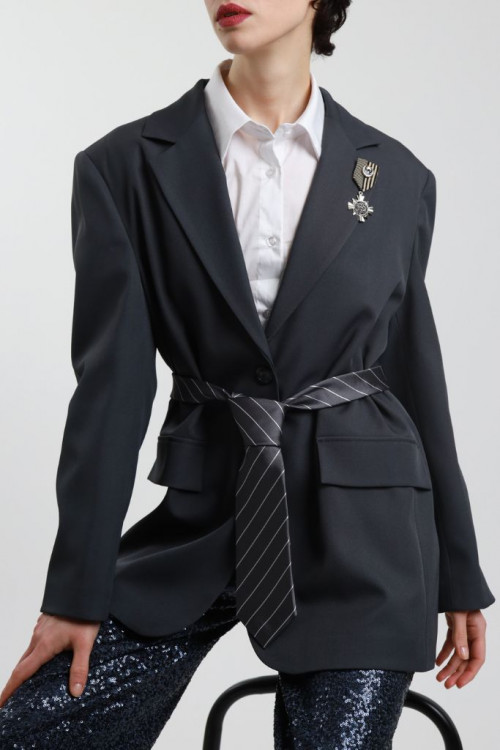 Blazer con Cravatta in Vita e Spilla Rimovibile. Tasche a Pattina e Rever Classico.