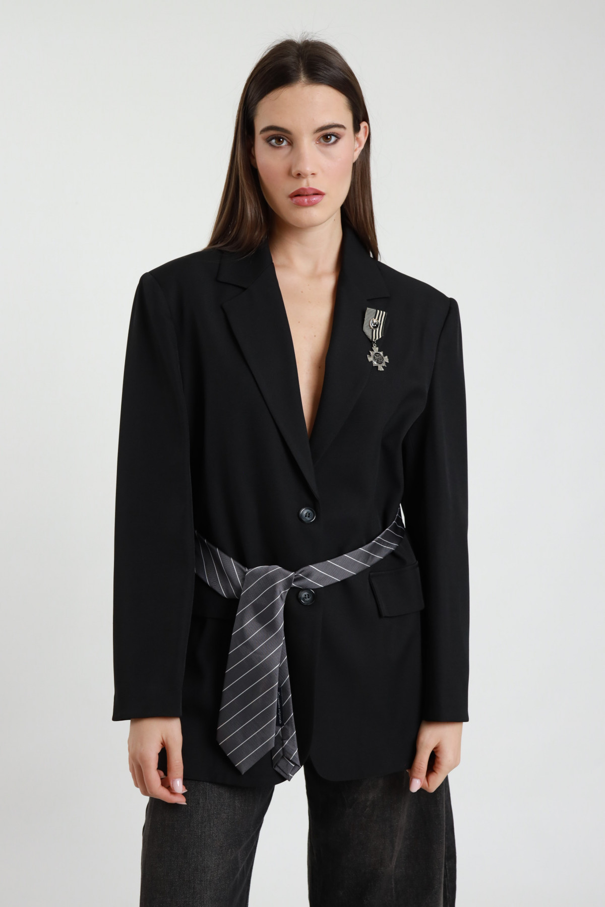 Blazer con Cravatta in Vita e Spilla Rimovibile. Tasche a Pattina e Rever Classico.