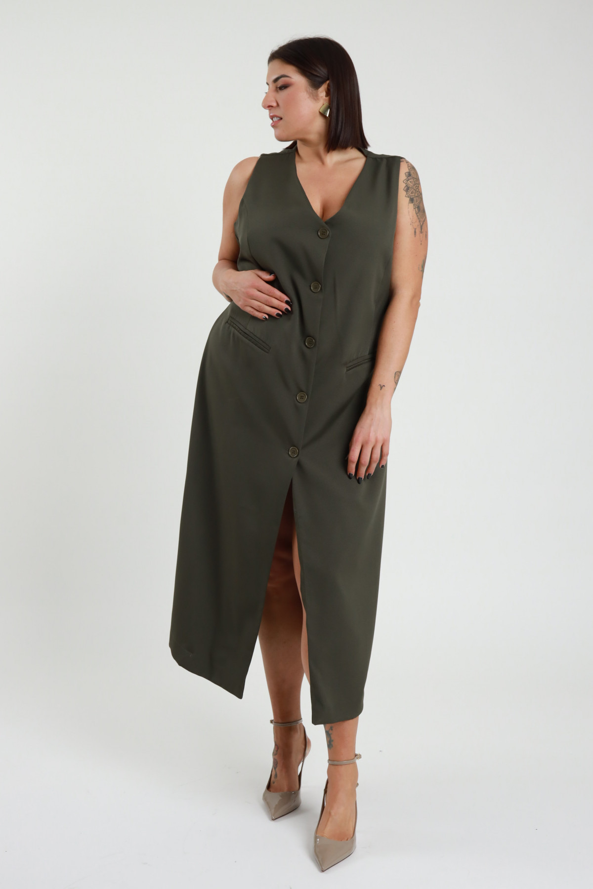Langes ausgestelltes Kleid, V-Ausschnitt mit Knopf – Linie Curvy Susy Star. 100%pl