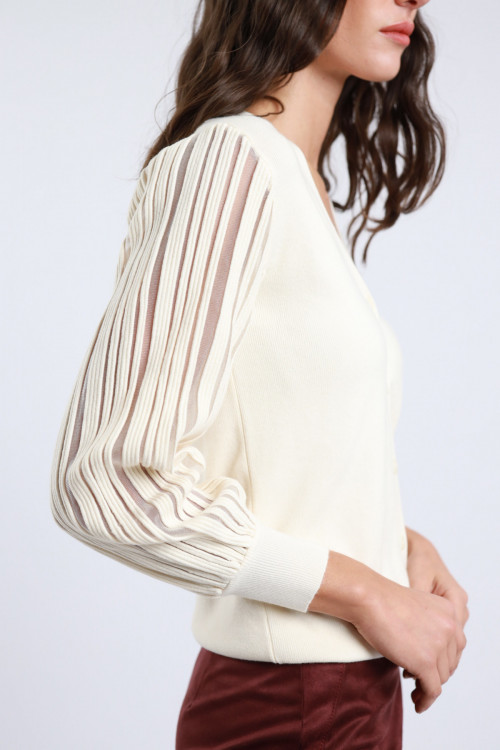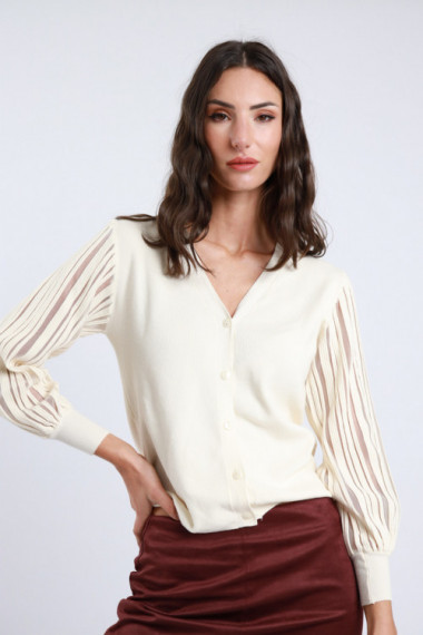 Strickjacken mit halbtransparenten Ballonknöpfen und Ärmeln schließen. 56%VI 28%PL 16%PA
