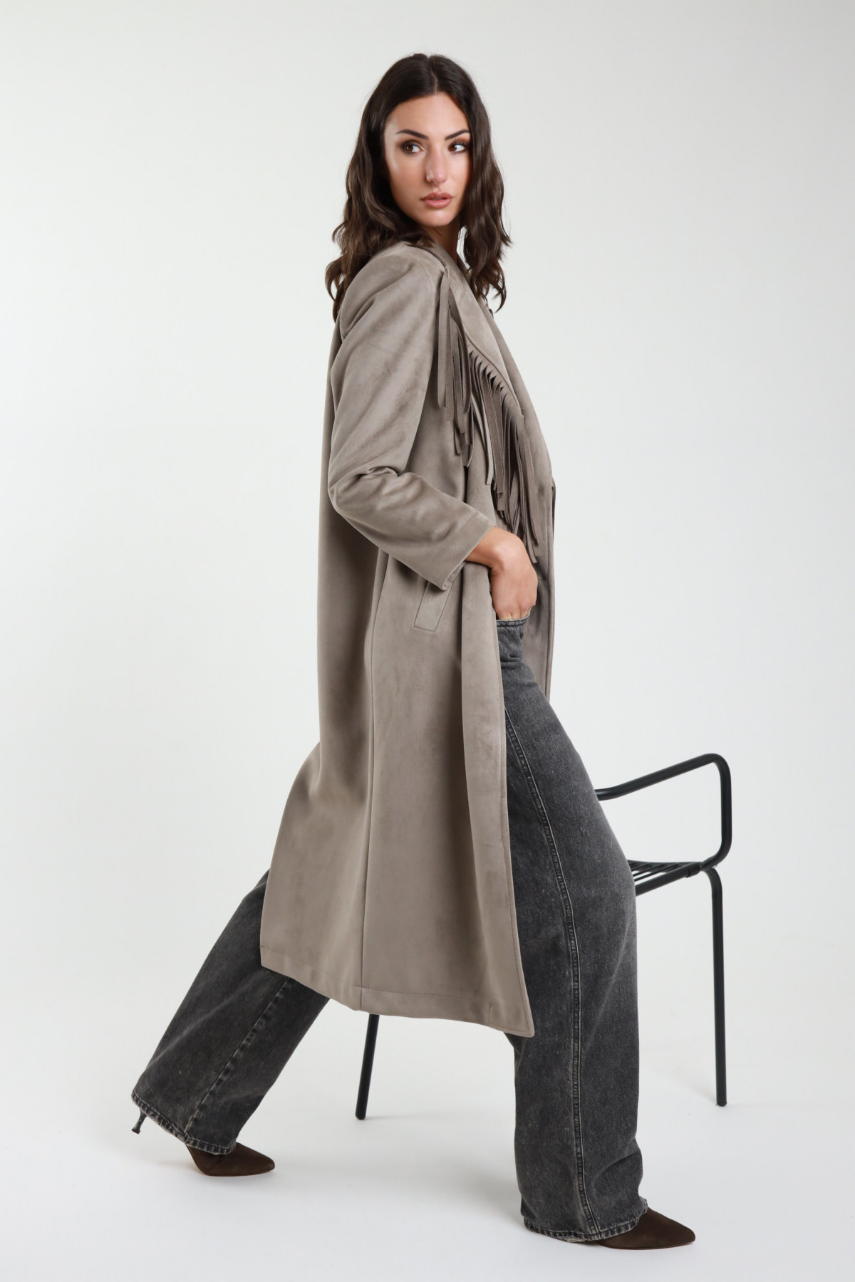Wildledermantel mit klassischem Revers mit Fransen und Seitentaschen. 97%pl 3%ea+100%pl