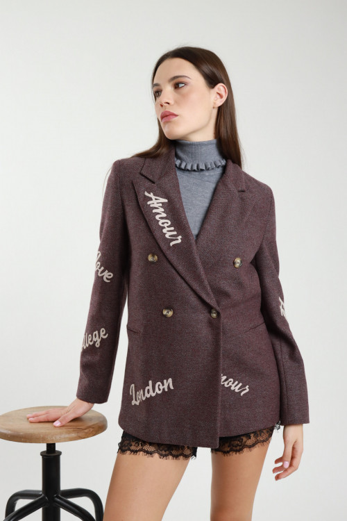 Blazer Monopetto Chiusura 3 Bottoni con Dettaglio Frange sul Rever e sulle Maniche, Tasche Filetto con Pattina.