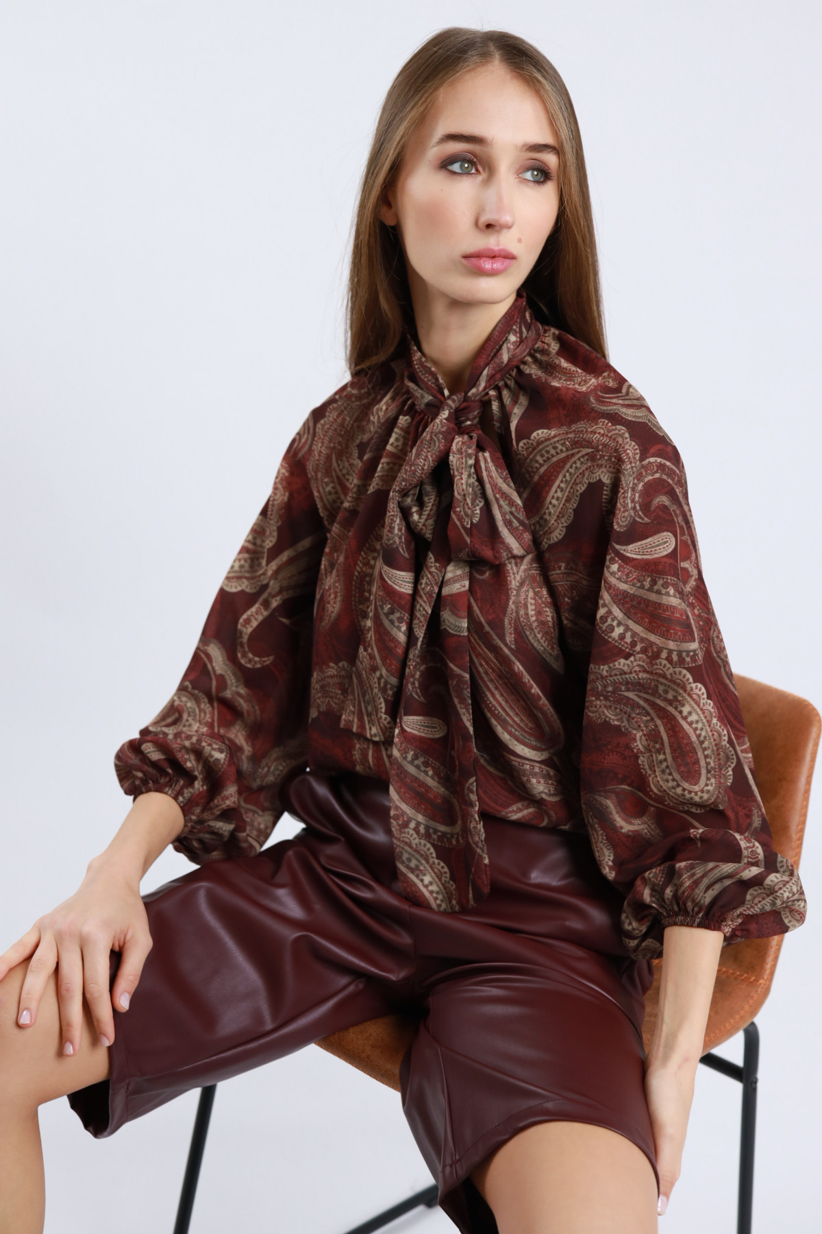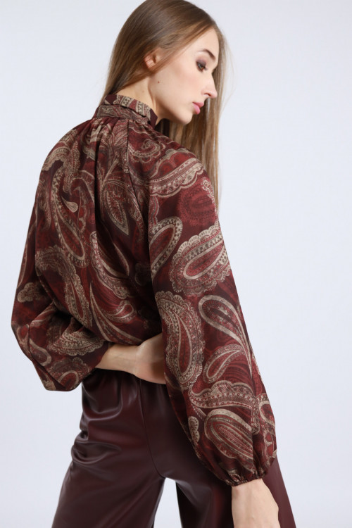 Camicia in Fantasia Geometrica con Fiocco sul Collo e Maniche a Palloncino.