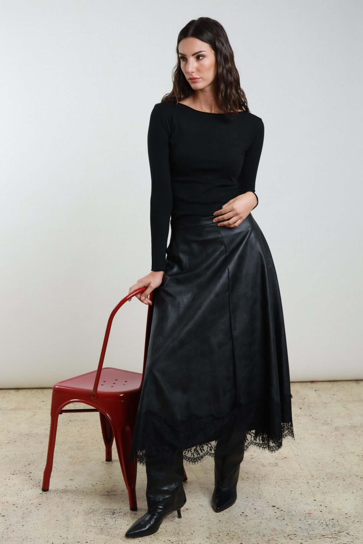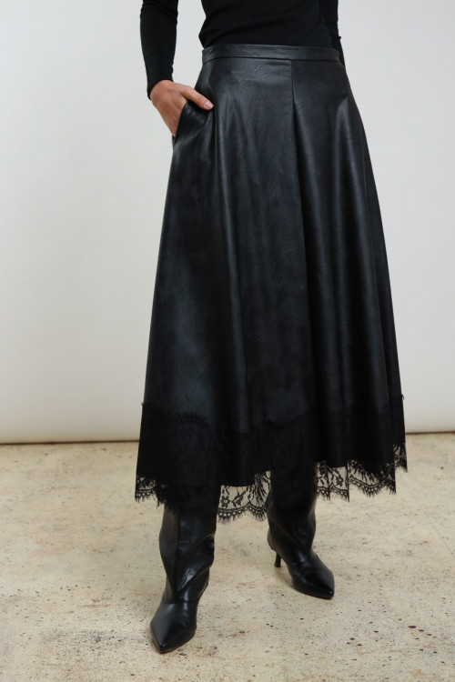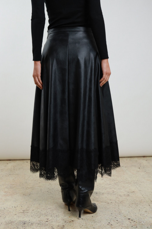 Langer Rock im Rad Eco -Leder mit Spitze auf der Unterseite. 50%PL 50%VI