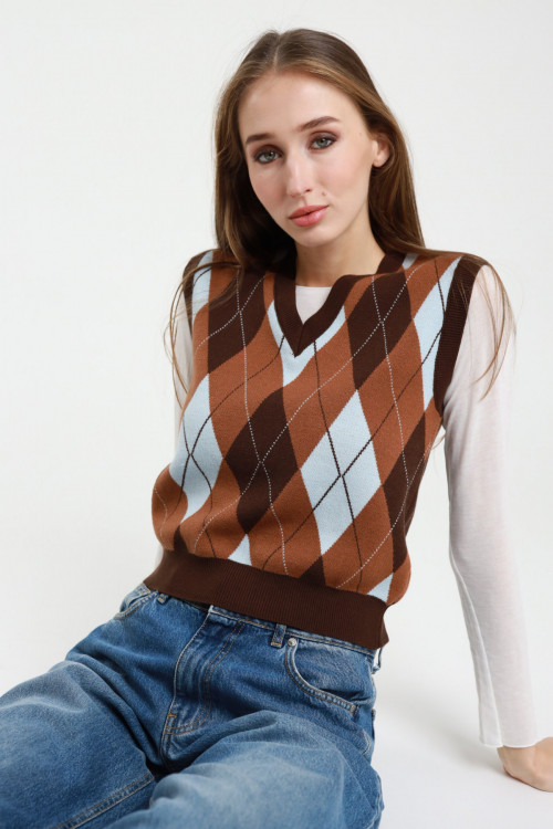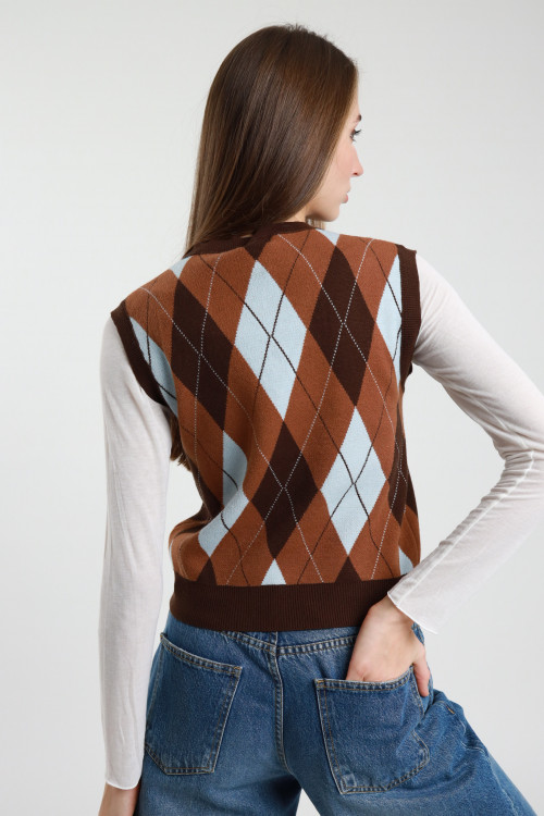 Schmale Weste mit Rautenmuster und V-Ausschnitt.  52 % vi 28 % pl 20 % pa