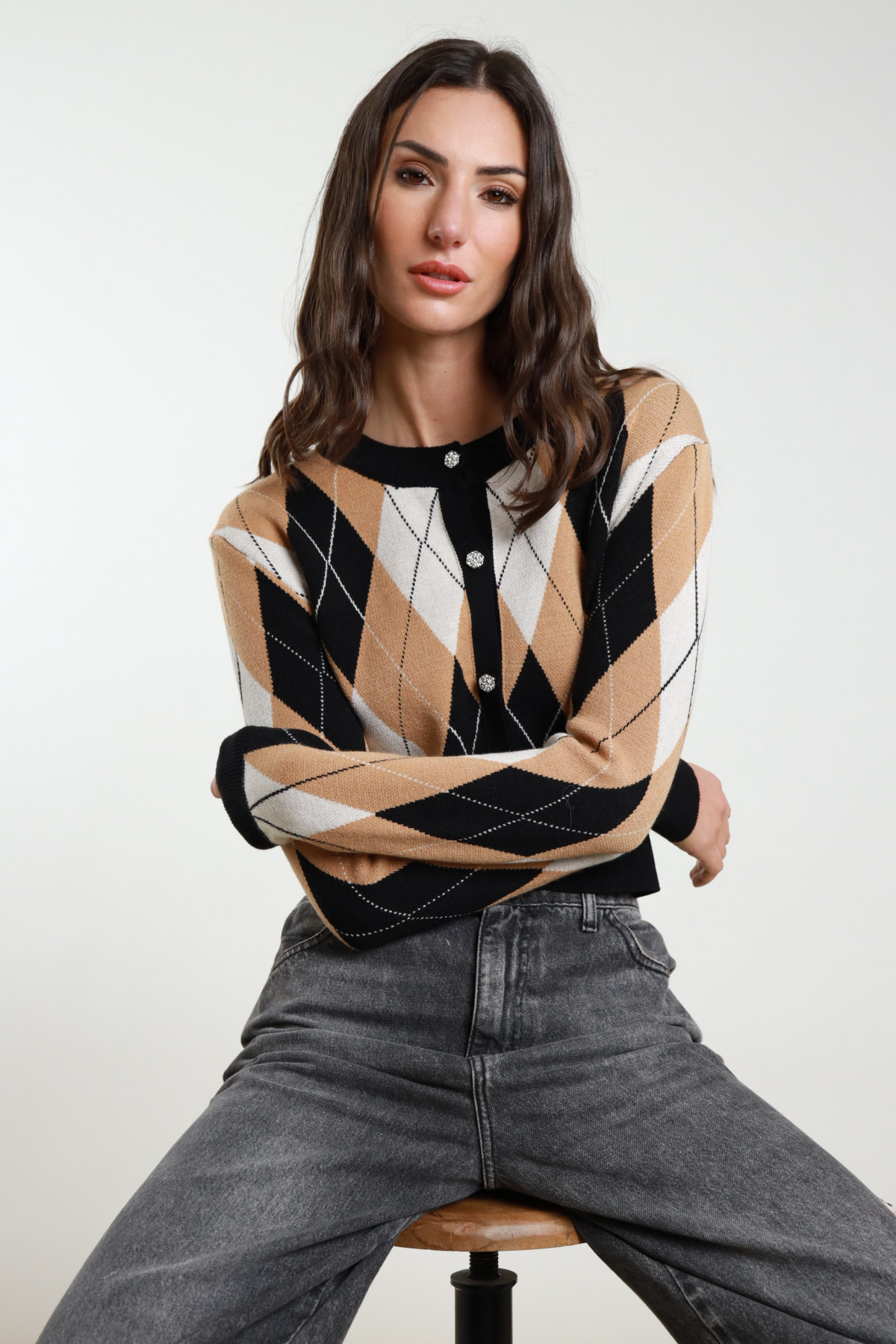Kurzer Diamant-Cardigan mit Schmuckknopfverschluss. 52 % vi 28 % pl 20 % pa