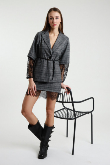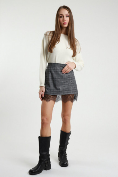 Mini Gonna in Fantasia Quadri e Frange Lunghe con Chiusura Zip sul Retro.