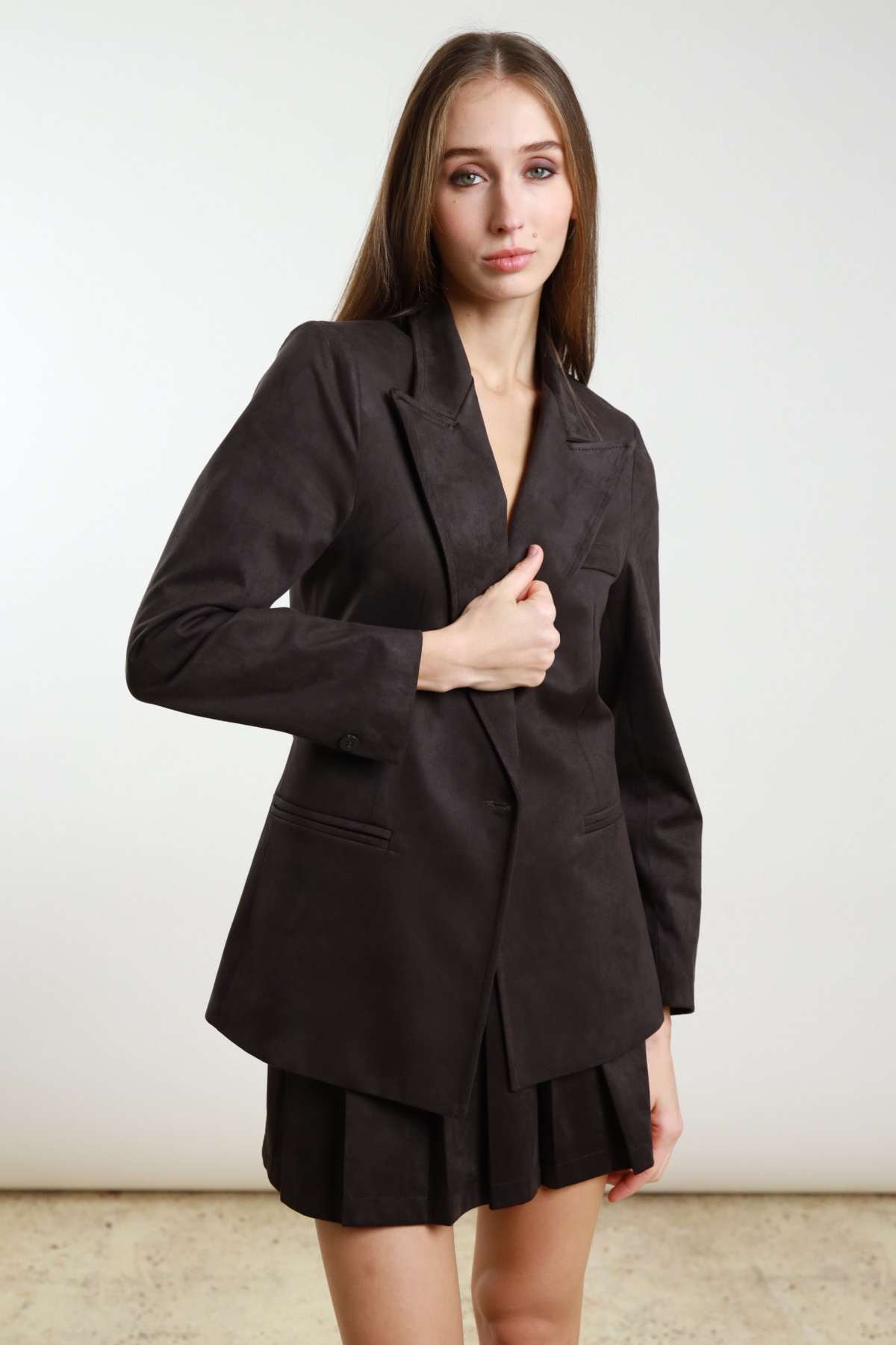Bomberjacke mit Hahnentrittmuster, Cordkragen und abnehmbarer Brosche. Reißverschluss und Seitentaschen. 80%pl 10%wo 10%af+100%pl