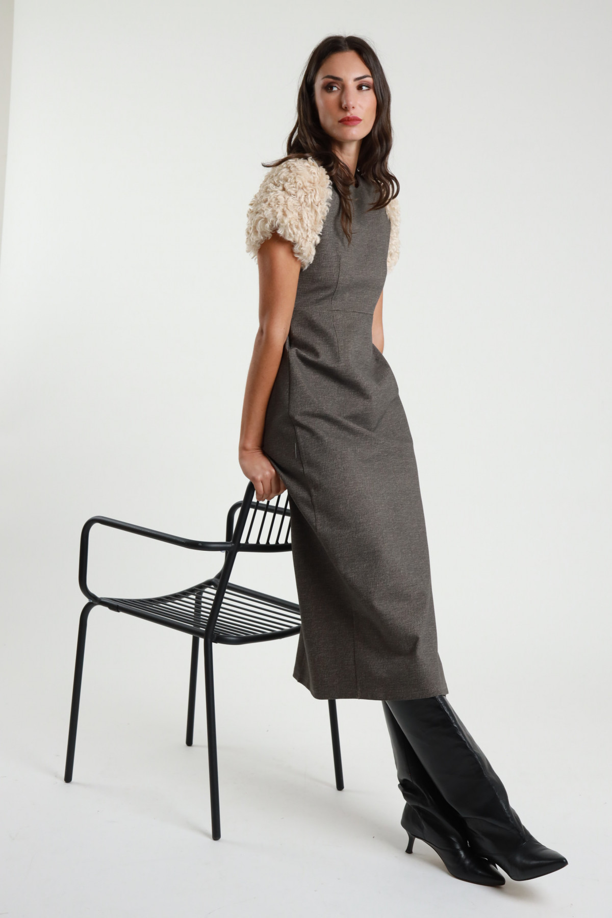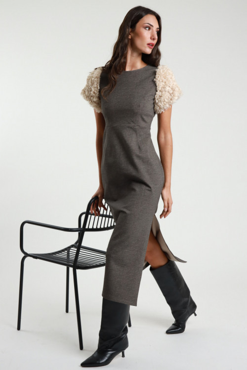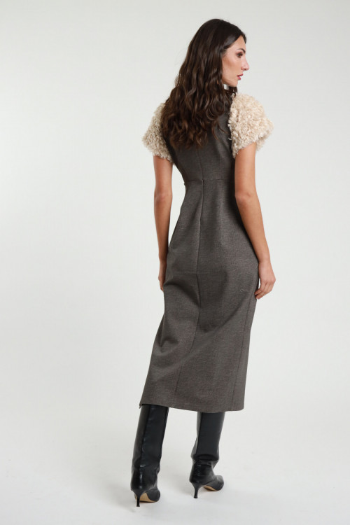 Midi-Kleid mit kurzen Ärmeln aus Kunstpelz und Schlitz auf der Rückseite. 68 %vi 27 %ny 5 %ea