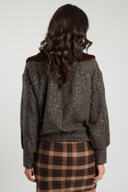 Fischgräten-Bomberjacke mit Pelzkragen und Schmuckdetail. Seitentaschen. 100%pl