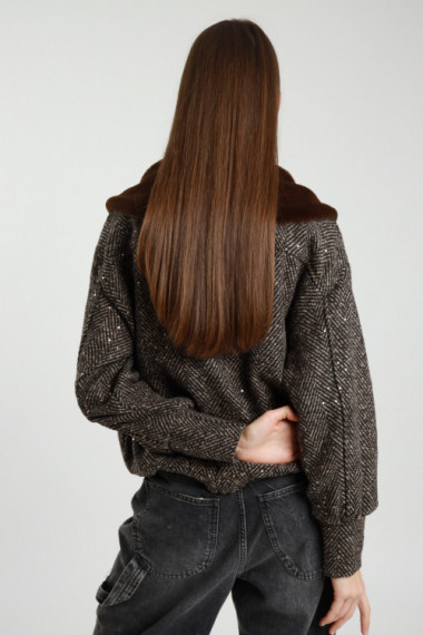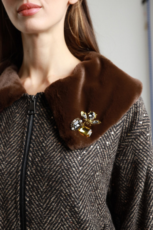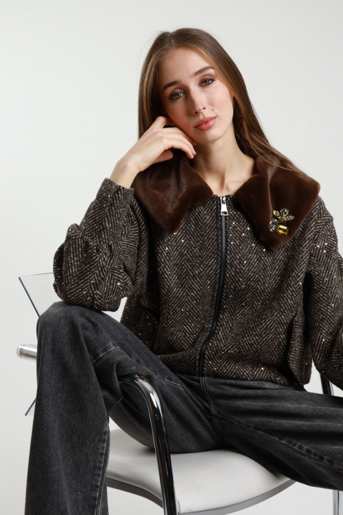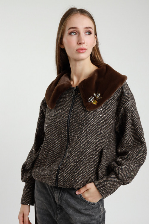 Fischgräten-Bomberjacke mit Pelzkragen und Schmuckdetail. Seitentaschen.  100%pl