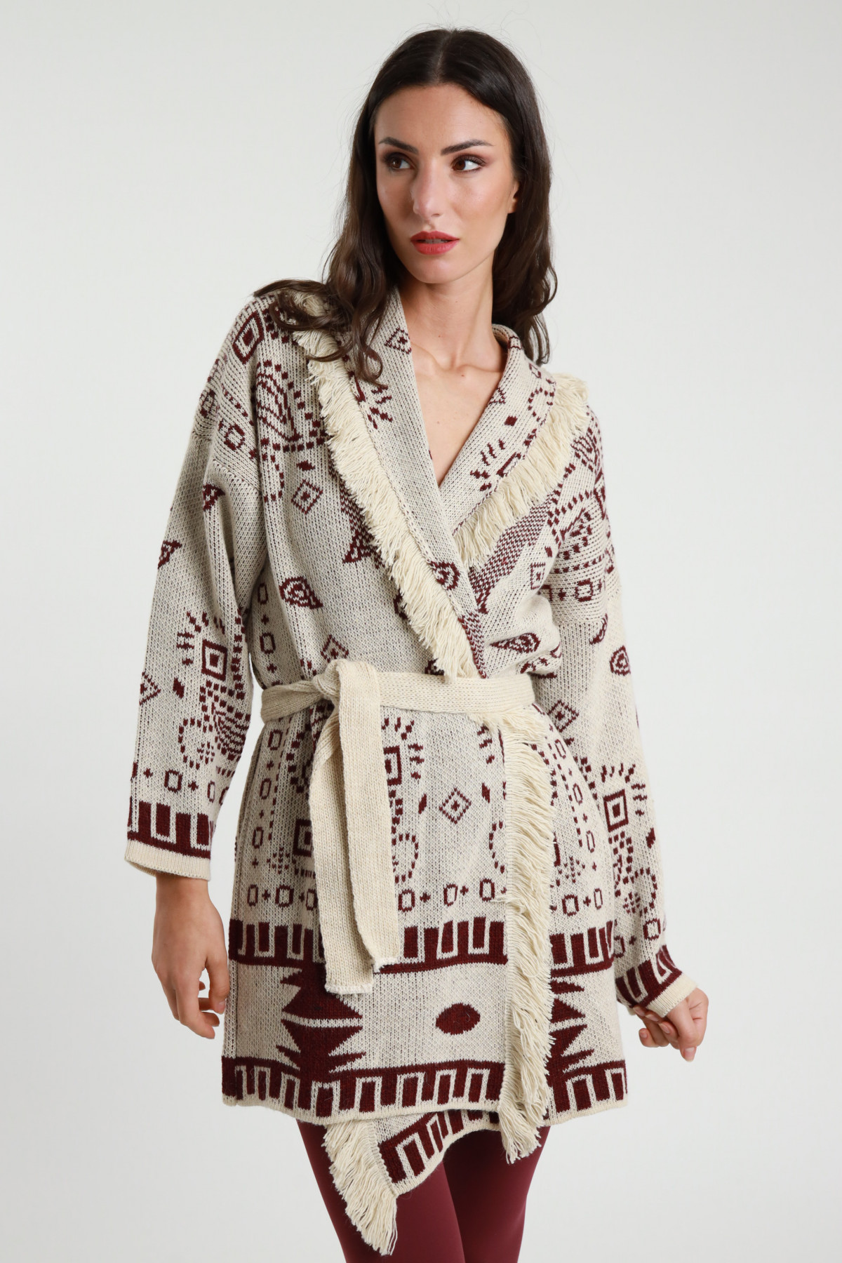 Jacquard-Cardigan mit Fransen und Taillengürtel. 75%pc 10%wo 10%vi 5%wp