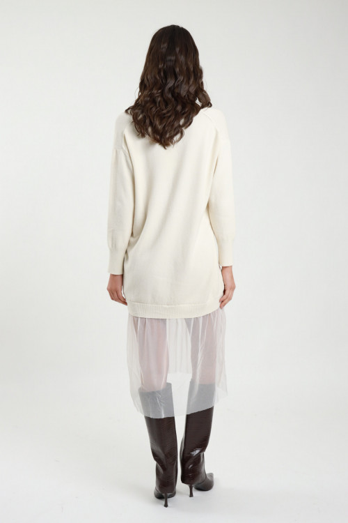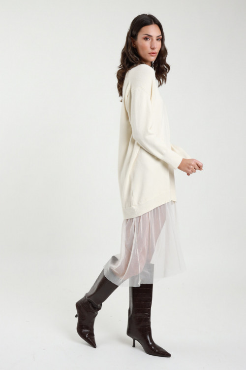 Maxi-Pullover mit V-Ausschnitt und Tüllrock. 50 % vi 27 % pl 23 % pa