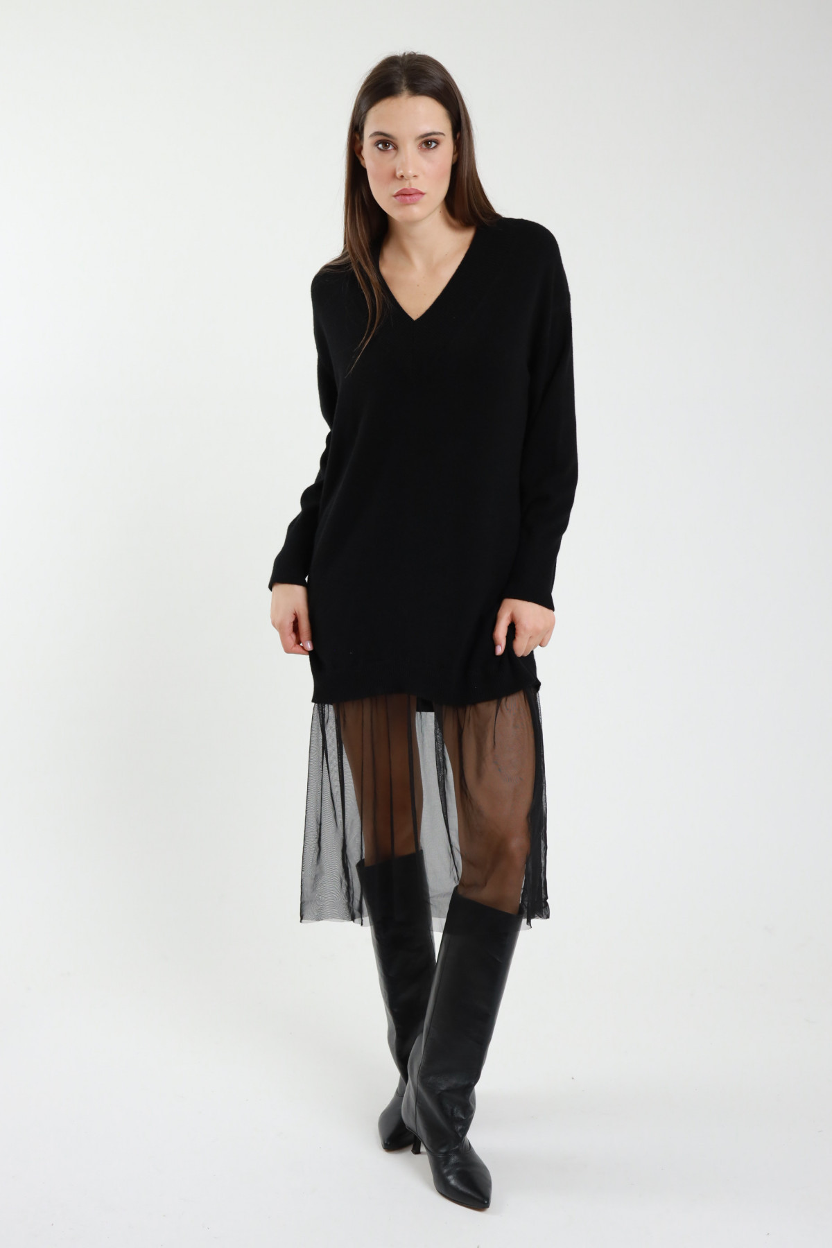 Maxi-Pullover mit V-Ausschnitt und Tüllrock. 50 % vi 27 % pl 23 % pa