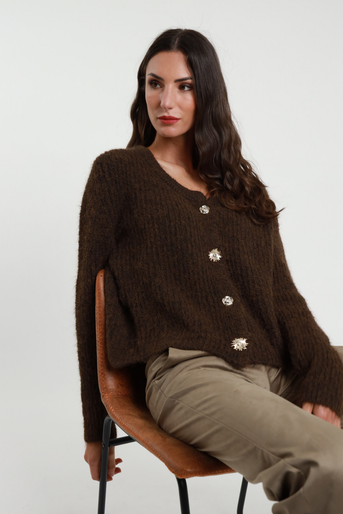 Strickjacken mit halbtransparenten Ballonknöpfen und Ärmeln schließen. 56%VI 28%PL 16%PA