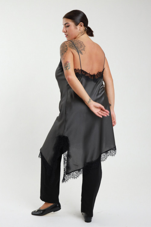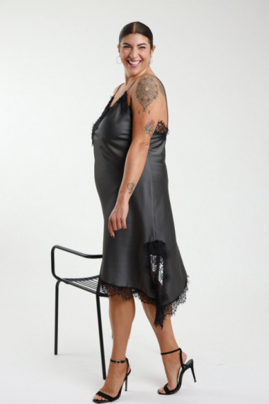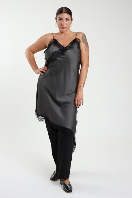 Asymmetrisches Kleid mit V-Ausschnitt in Satinoptik mit Spitzendetails – Linie Curvy Susy Star. 100%pl
