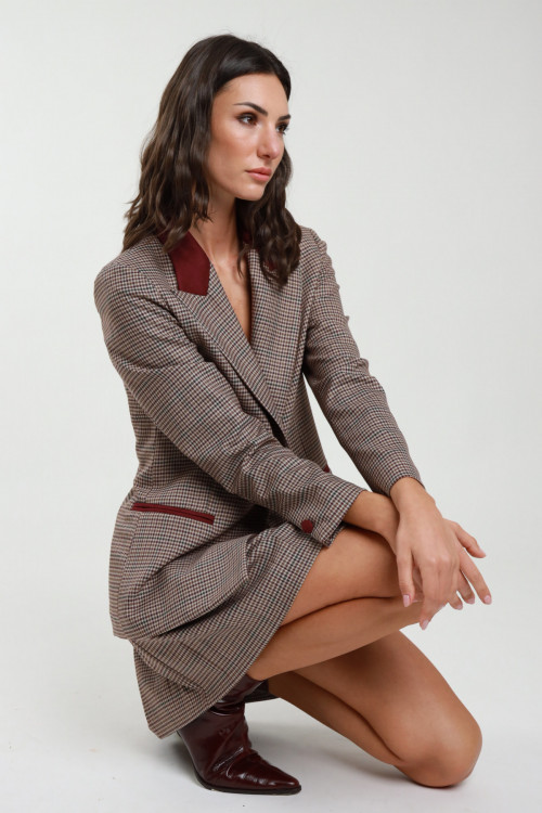 Blazer Oversize Jacquard Pied de Poule con Maniche in Fantasia Cashmere e Frange Applicate sulle Tasche. Spilla sul Rever.
