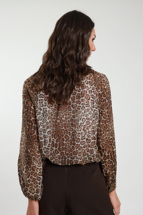Camicia Semitrasparente in Stampa Animalier Leopardata con Maniche Palloncino.