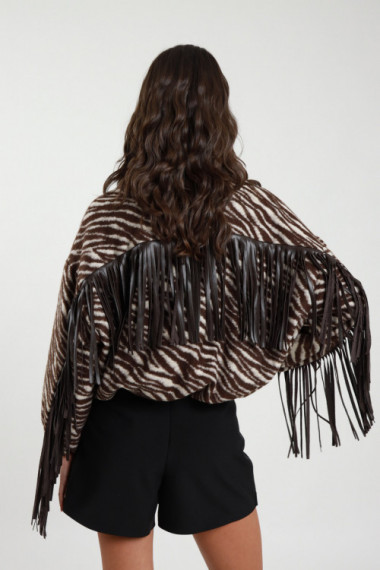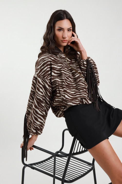 Zebra-Bomber mit Fransen auf der Rückseite. Kragen aus Kunstleder. 80%pl 20%wv+50%pu 50%pl+100%pl