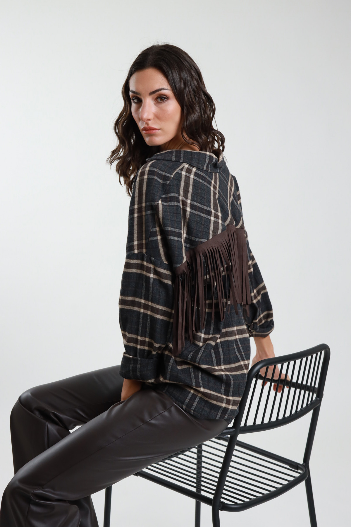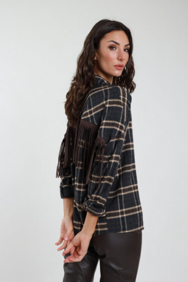 Camicia Over a Quadri con Frange sul Fondo e Tasche Frontali Applicate.